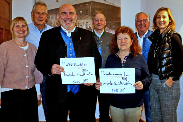 Emertsham. Je einen Scheck von 900 Euro erhielten der Wirtshauserhaltungsverein (WEV) und die Schützengesellschaft Emertsham aus dem Erlös des Loseverkaufs für die Tombola, die beim Christkindlmarkt durchgeführt wurde. Wie Monika Irlbacher sagte, haben viele das Angebot zehn plus ein Los gratis für zehn Euro angenommen, so dass bei einem Kontingent von 2000 Losen letztendlich eine Einnahme von 1780 Euro zusammen kam. Das habe Bernd und Monika Irlbacher auf 1800 Euro aufgerundet. Monika Irlbacher bedankte sich bei Alexandra Preintner für die Akquise der Preise und den Helferinnen beim Loseverkauf. Insgesamt wurden 23 Preise im Wert von zehn bis 600 Euro im Gesamtwert von 2550 Euro vergeben. Die Schecks nahmen bei der Jahreshauptversammlung des König-Ludwig-Vereins für die Schützengesellschaft die Schützenmeister Theresia Schlögl und Werner Becker, sowie für den WEV Anton Gruber von Bernd und Monika Irlbacher in Empfang. Die jeweils 900 Euro sollen beim WEV in die Anschaffung eines Elektroherdes, bei der Schützengesellschaft in den Standumbau einfließen.